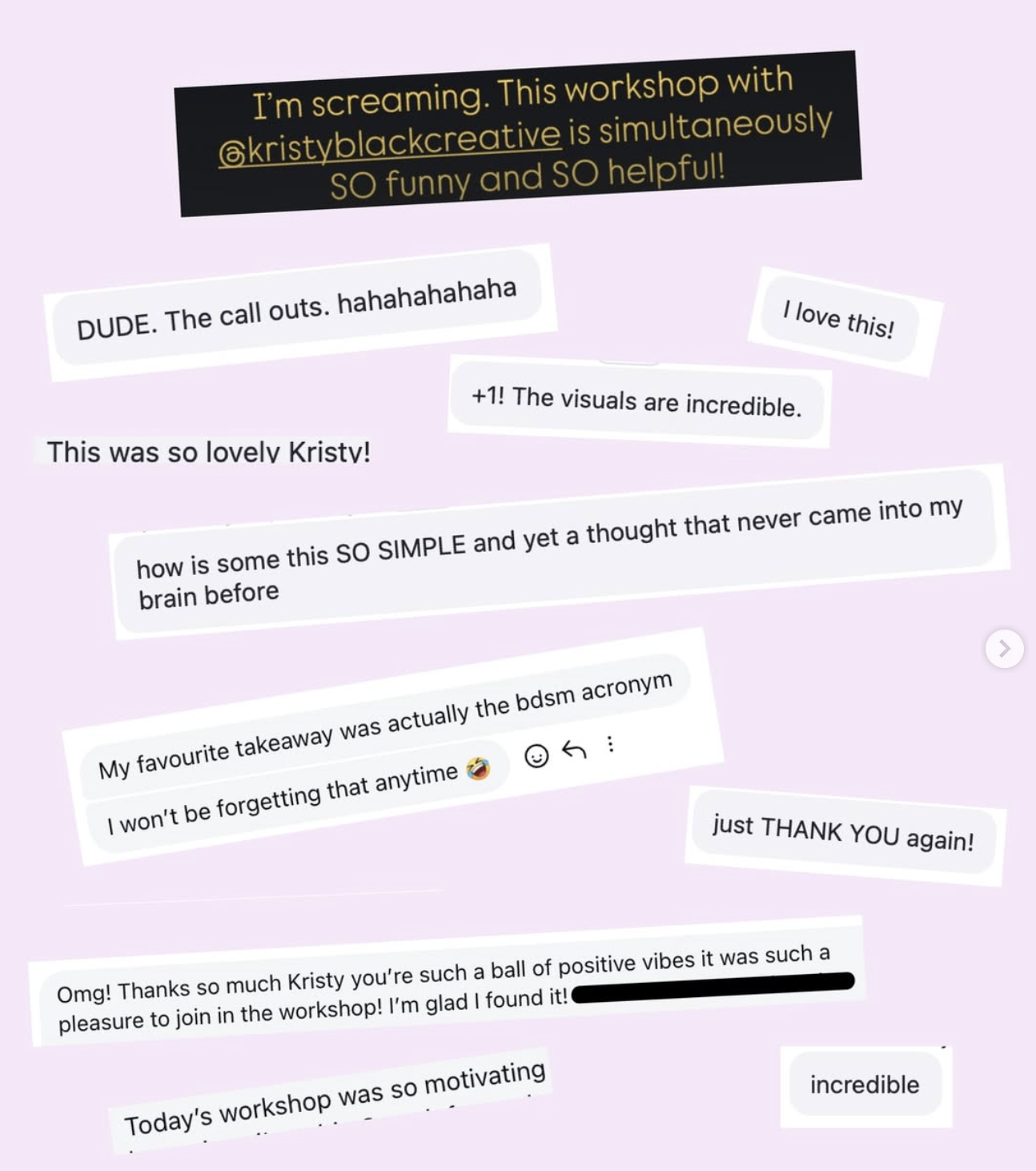 Most people only give testimonials from paid programs, but even my free workshops get people hyped up!